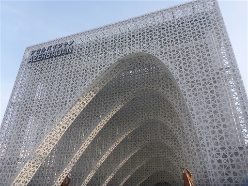 アゼルバイジャンパビリオンはアラベルク模様のような外観だ。