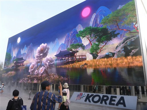 韓国パビリオンの前には巨大ディスプレイがある。