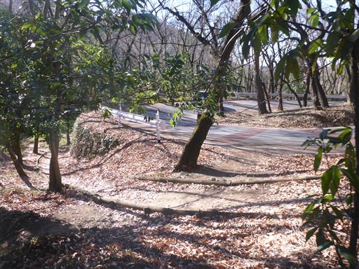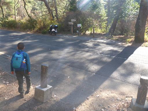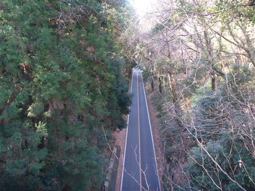 途中で車道とニアミス。登りで展望台のあった場所に続く車道だ。