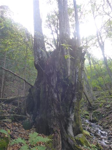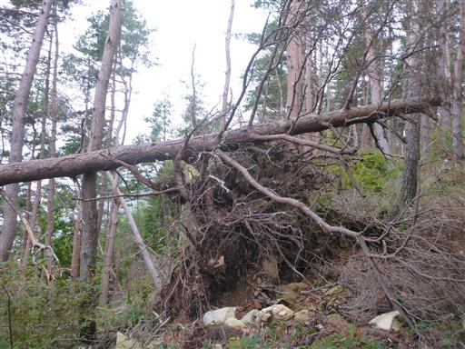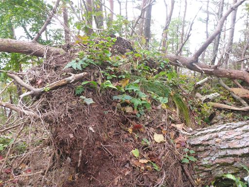 こちらの倒木はまだ新しそうだ。小さな植物が倒木に巻き込まれて持ち上げられている。