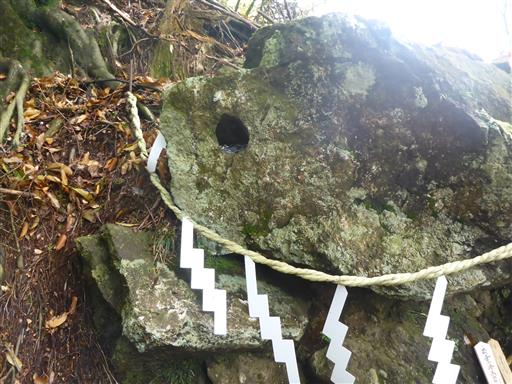 天狗の鼻突き岩。天狗が鼻を突いてあけた穴と言われている。