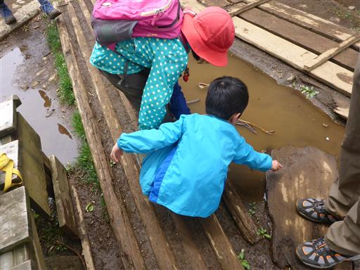 子供たちは水たまりと虫で遊んでいる。