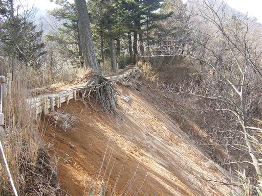 崩落地。この辺りから尾根がだんだん細くなってくる。