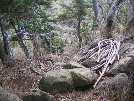 この辺りから鎖場が始まる。登山者が捨てていったと思われる棒がたくさん落ちている。