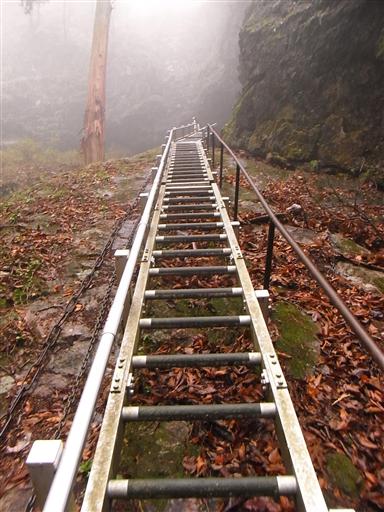 急峻な崖につけられた梯子を下る。