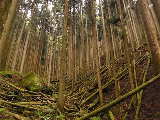 整然と並ぶ杉林に、多くの倒木が転がっている。