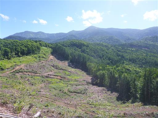樹林帯の中をしばらく登ると伐採地に到着。