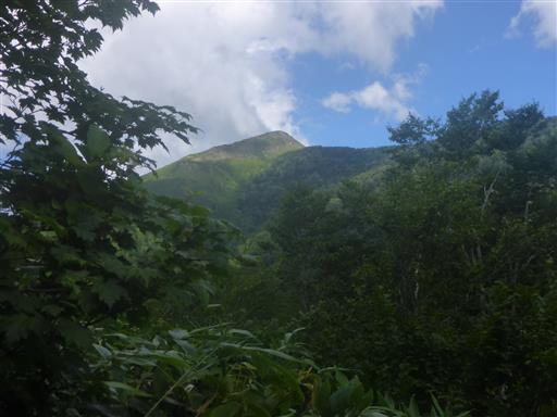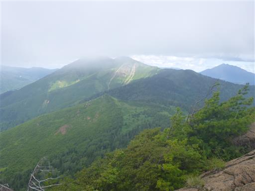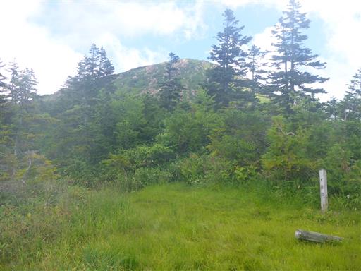 伐採地まで下山する。もう至仏山は雲の中。笠ヶ岳も山頂部はほとんど見えない。