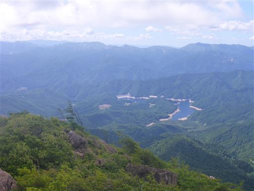 眼下には、ならまた湖。その左の木がない部分が、登山時にこちらを眺めた伐採地だ。