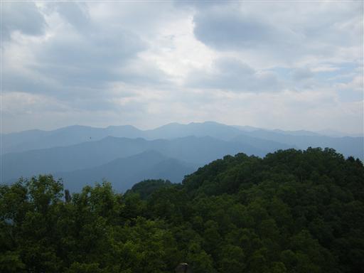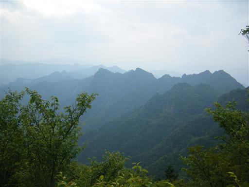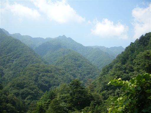山頂からの眺め。山が幾重にも折り重なって見える。