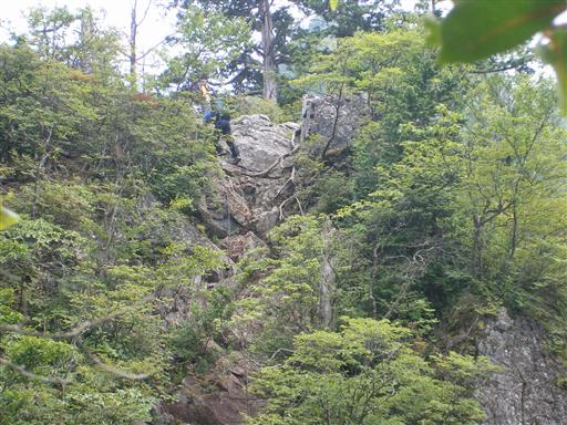 鞍部を挟んだ向かい側には鎖場を降りる人が見える。