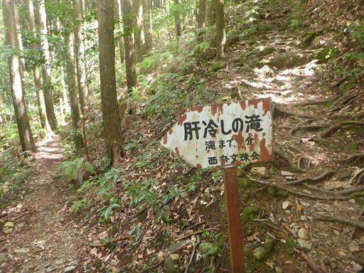 肝冷しの滝の標識。少し足を延ばして寄り道してみる。