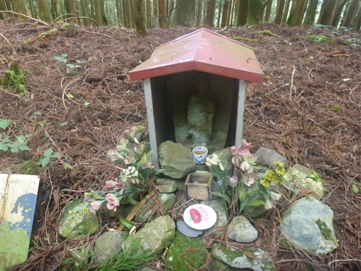 石像が祀られている。お供え物に寿司が置かれているように見える。