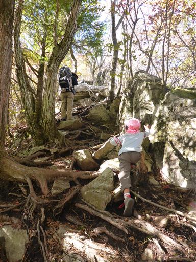 釈迦ヶ岳に至る急斜面に取りつく。娘は手を使って頑張って登っている。