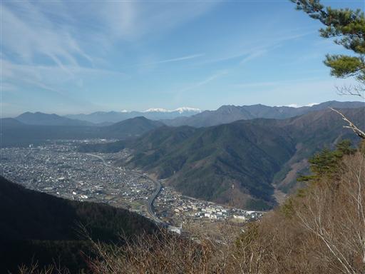 眼下に広がる富士吉田市街。遠くには真白な南アルプスの峰々がくっきりと見えている。