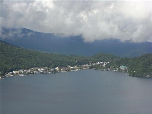 中禅寺湖畔には、宿屋や土産物屋が並んでいるのが見える。