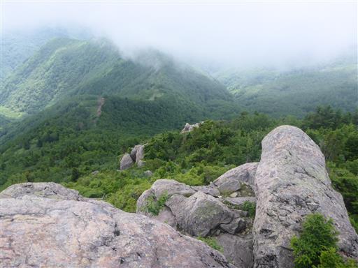 岩がちな山で、眼下に岩が続いている。