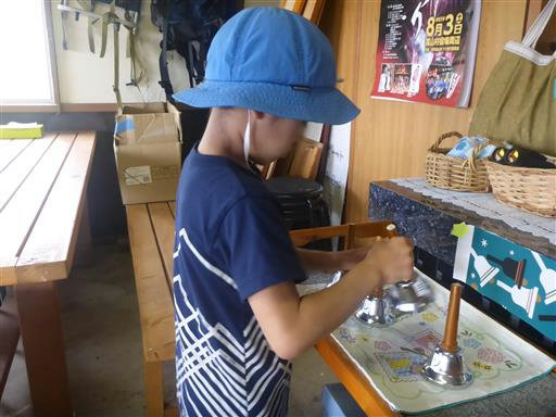 息子は置いてあったハンドベルを熱心に触っている。