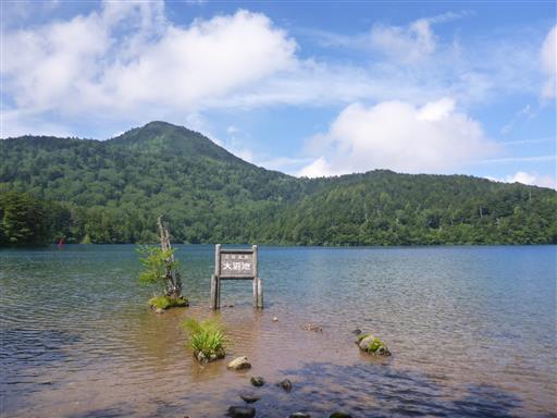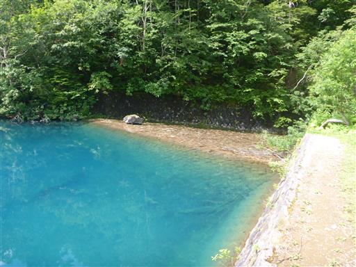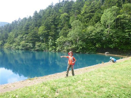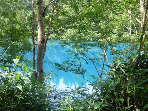 大沼池に到着。驚くほど青い湖だ。