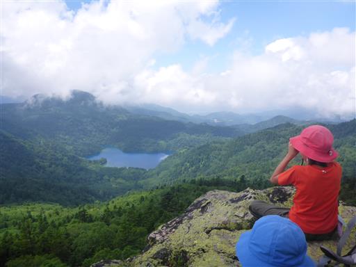 岩の上からは大沼池が見下ろせる。光が差すと一層青く輝く。