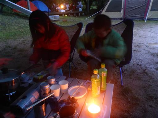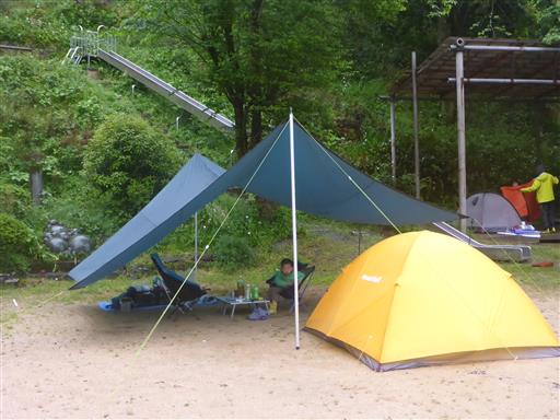 タープは今回新調したもので、まだ慣れていないので、雨中で張るのに苦戦した。