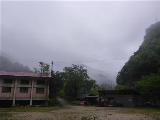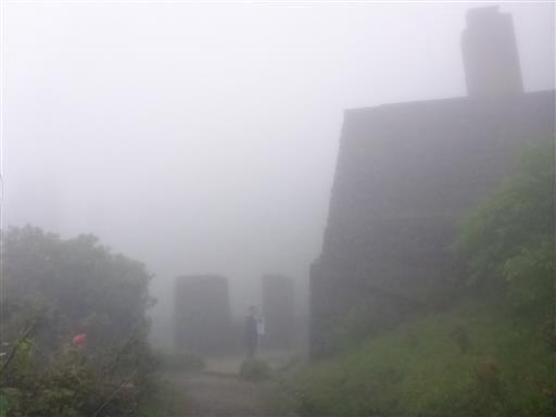 東平索道停車場跡。霧の中浮かび上がるその姿は異様だ。