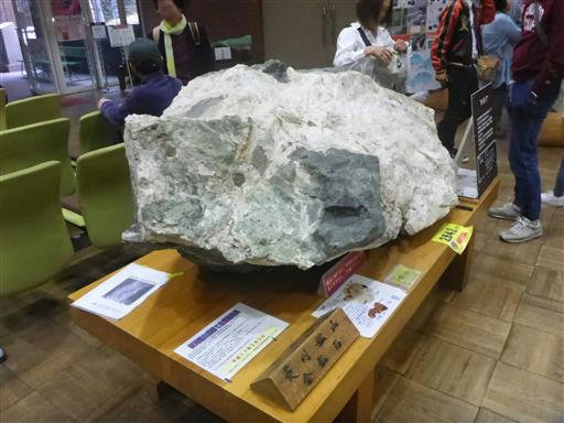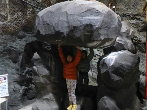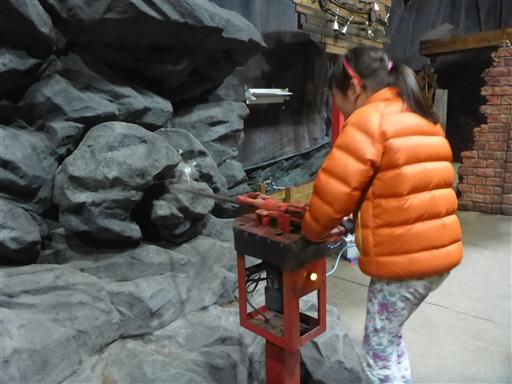 削岩機体験。ボタンを押すと削岩機が揺れて、目の前の岩が砕ける(開く)。