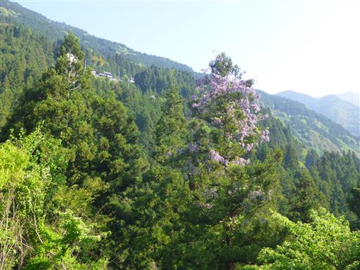 立派な木に藤の木が巻き付いて、きれいな花を咲かせている。