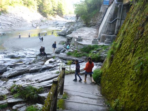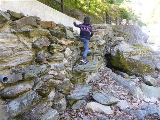 河原と道を繋ぐ階段は、壁に石が突き刺さった面白い造りになっている。