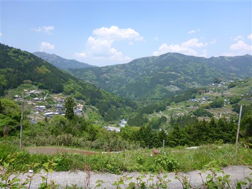 向かったのは龍王の滝。道中の山の斜面から望む山村風景が美しい。