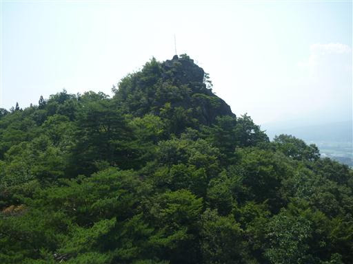不動岩から小天狗を見上げる。真夏のため濃い緑に覆われている。
