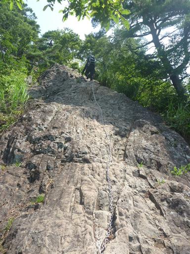 少し陰気な登山道を抜けると不動岩直下の岩場が現れる。