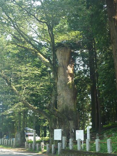 県指定天然記念物の大ケヤキは上部がなくなっていて、なぜか屋根が取り付けられている。
