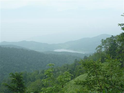 展望が少し開けたところで、眼下に野反湖がわずかに見える。