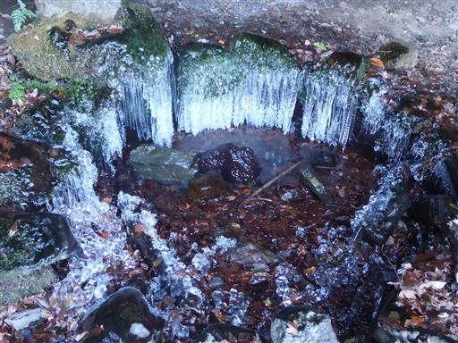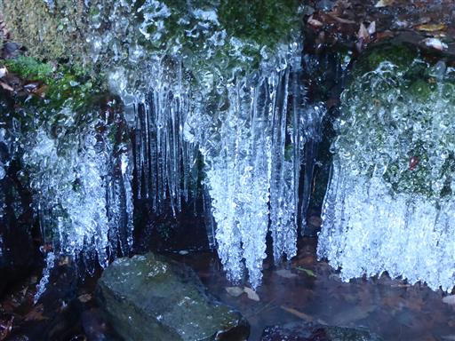 洞窟上部から滴り落ちた水が、見事な氷のオブジェを造っている。