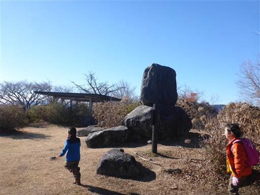 カップラーメンができるのを待つ間、子供たちは土肥城址と書かれた石碑に上って遊んでいる。