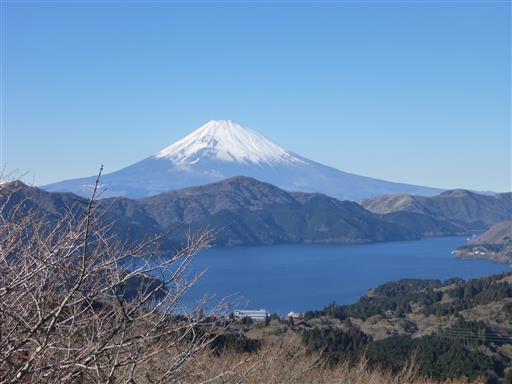 芦ノ湖の背後に見事な富士が聳え立っている。
