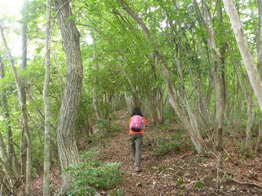 植林地帯の急斜面を登りきると、自然林の尾根道になる。