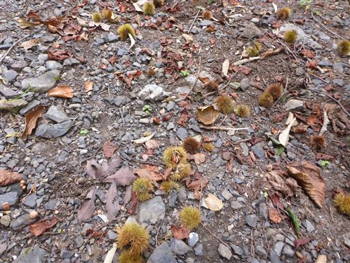 再び林道に出てくる。足元には無数の栗が落ちている。