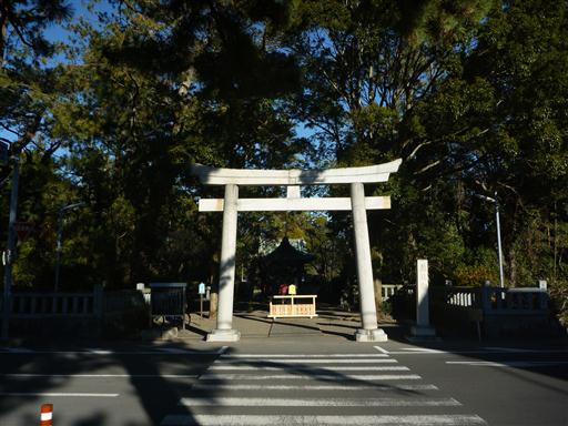 神の道をしばらく歩くと鳥居が現れる。車道を渡って鳥居を潜る。
