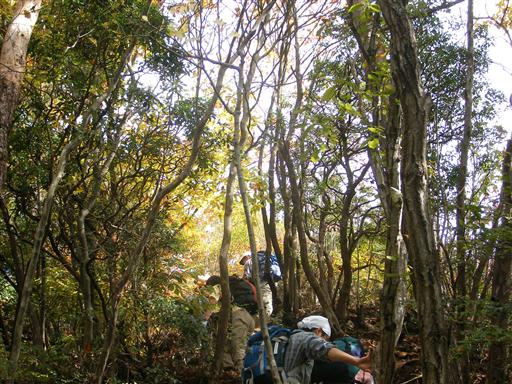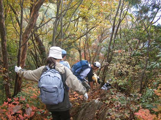 下りも急坂。木につかまって下る。