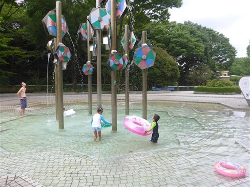 子供たちはたまに落ちてくる水を浮輪で受け止めて遊んでいる。
