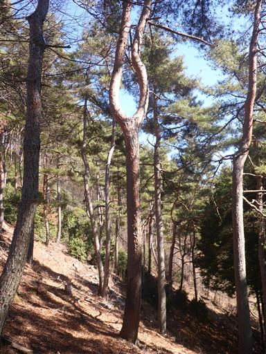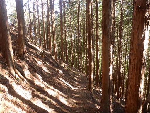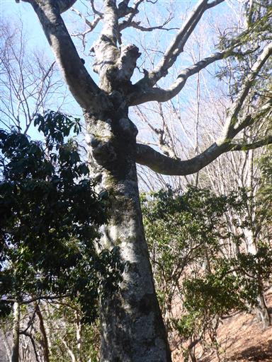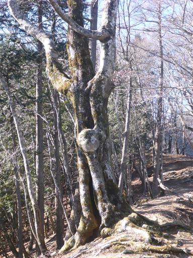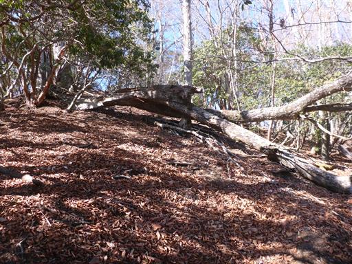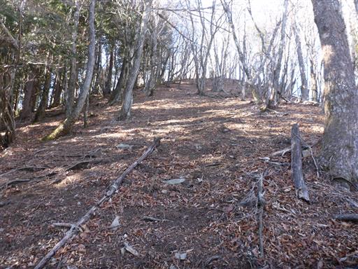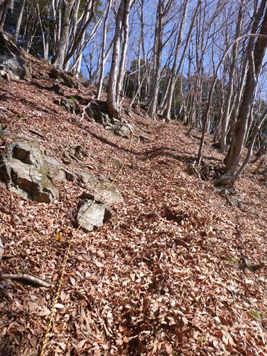 上の方まで登ると落葉樹になる。落ち葉が積もっていて、滑って登りにくい。