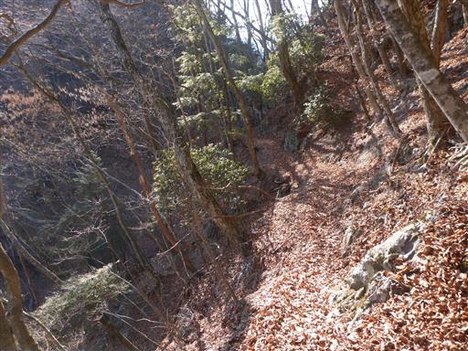 急斜面のトラバース道に滑りやすい落ち葉が大量に堆積しているため、歩きにくい。