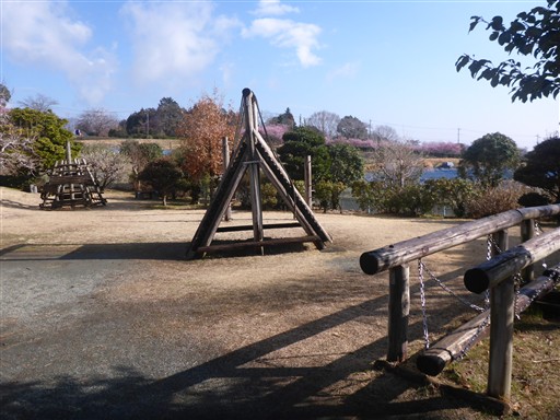 広場にアスレチックが少しある。昨夜の雨で濡れていてよく滑る。