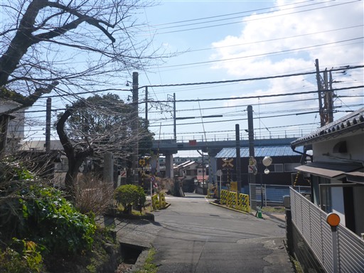 入り乱れる線路。さきほどの高架の御殿場線と、踏切、奥に東海道線の電車が見える。