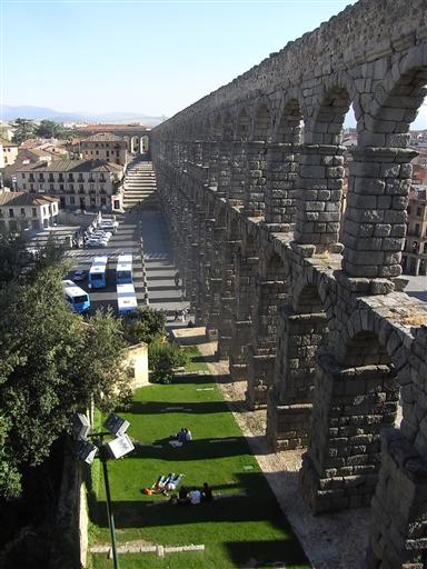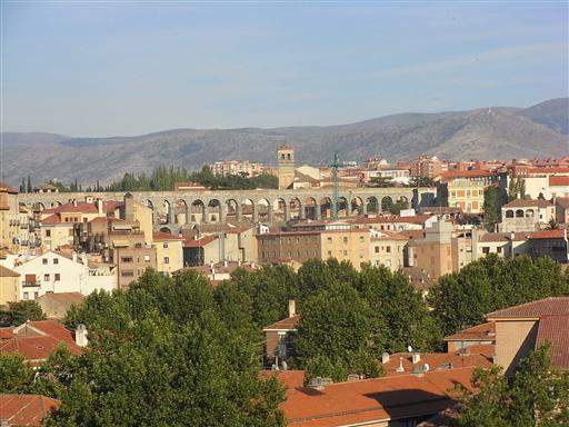 セゴビアの町とローマ水道橋、そして背後には山が見えている。