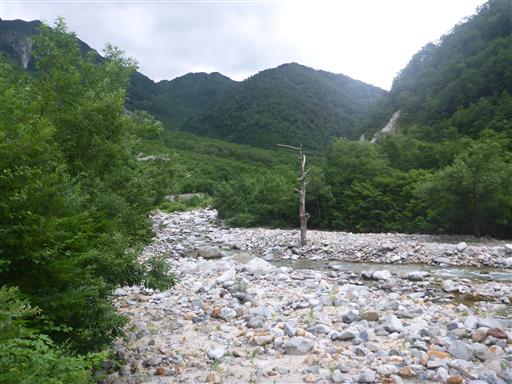 沢沿いの道が続く。河原に立つ一本の枯木が目立っている。