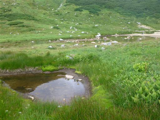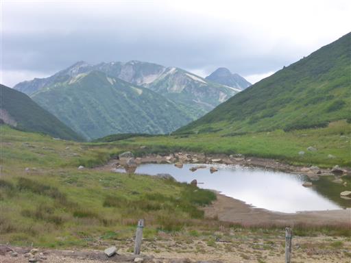池の畔にはチングルマの綿毛が見られる。