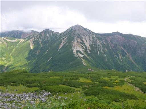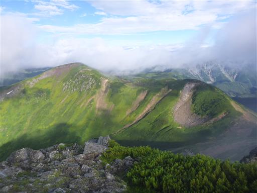 眼下のまだら模様に広がるハイマツが美しい。
